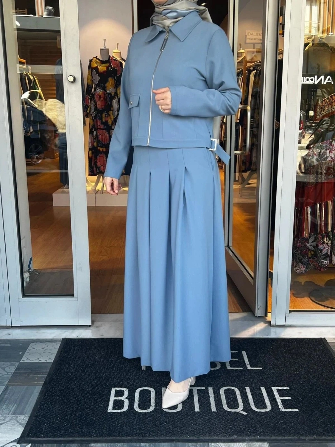 Kısa ceketli, pantolon etekli takım.